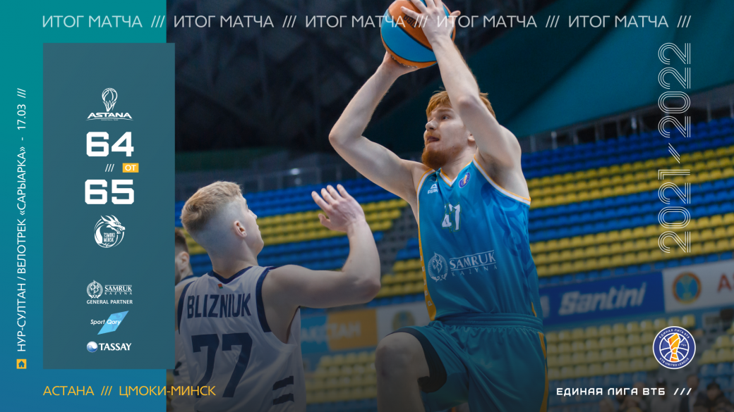 Ключевой момент: Исход матча решился под занавес овертайма. За 21 секунду до сирены Близнюк набрал 2 очка в проходе, после чего рухнул на паркет с судорогами и на площадку не возвращался. В ответной атаке Рустам Мурзагалиев нашел контакт с Эрнандес-Зиненко и реализовал два штрафных – 64:63 за 15 секунд до конца. «Цмоки» четко разыграли комбинацию после тайм-аута, Борисевич оказался под кольцом против Марка Тихоненко, игрок сборной России сфолил. Даниил хладнокровно вернул «драконам» лидерство бросками с линии. У «Астаны» не оставалось тайм-аутов, попытка сделать передачу через всю площадку из-за лицевой обернулась потерей – белорусы вырвали победу.